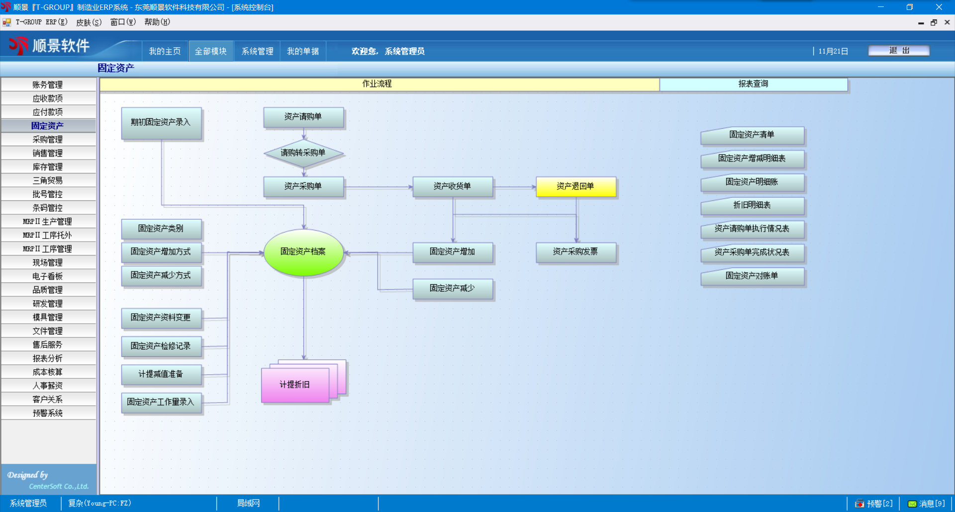 4. 对于资产的日常变动,系统提供资产改良、重估、报废、出售、调整等日常作业,可以重新计算帐面价值、折旧年限及折旧金额等信息。若为资产检修,可自动连至应付管理系统,自动生成应付凭单;若为资产出售,可自动计算处理损益,并自动结转生成应收管理系统的结帐单。所有日常变动均可生成对应的会计分录,供财务人员审核入帐。